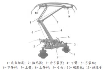 DSA250 型受電弓是單臂受電弓,具有重量輕,結構簡單和維護少的特點。其結構如下圖所示。