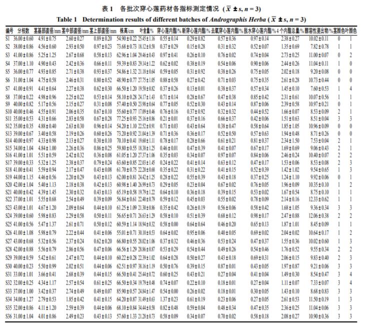 穿心蓮藥材采自廣東(S1~S25)、廣西(S26~ S30、S36)、福建(S31~S35)共 36 批,經廣東藥 科大學中藥學院曾令杰教授鑒定為穿心蓮 Andrographis paniculata (Burm. f.) Nees。