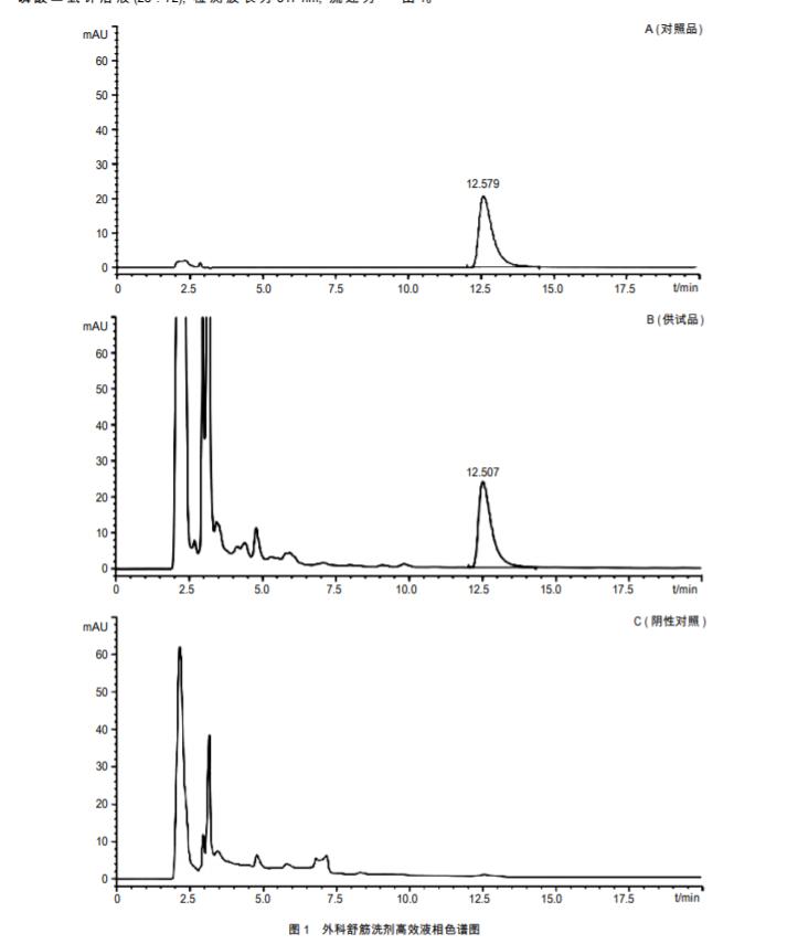 外科舒筋洗劑為本院院內制劑 , 具 有活血散瘀、舒筋通絡之功效 , 臨床用來治療跌打損傷、瘀 血等疾病 , 臨床應用多年 , 效果顯著。外科舒筋洗劑原標準 僅對蘇木、黃柏進行定性鑒別 , 不符合質量標準提升要求 , 對其日常生產質量也難于監控。本試驗曾經嘗試對兩面針中 氯化兩面針堿進行含量測定 , 但供試品峰面積偏小 , 考慮 現有工藝中該成分提取率不高, 故不再選擇兩面針作為研 究對象。黃柏在該制劑處方中為臣藥 , 其具有清熱、消腫、 止痛等作用 , 與兩面針等其他藥發揮活血散瘀、舒筋通絡止 痛之功效。黃柏主要以鹽酸小檗堿為主要有效成分。在 上述試驗條件下 , 經試驗證實 , 鹽酸鹽酸小檗堿試驗分離度 和重復性較好 , 且陰性無干擾 , 故選擇其為研究對象。
