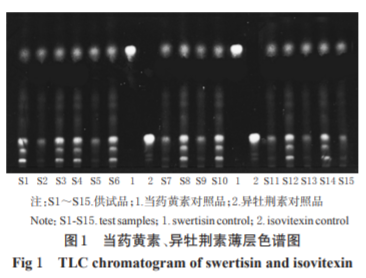 薄層板:聚酰胺薄膜;展開劑:三氯甲 烷-甲醇-冰醋酸(11∶1∶1,V/V/V);顯色劑:20 g/L的三 氯化鋁乙醇溶液;點樣量:對照品溶液 2 μL,供試品溶 液 4 μL。 2.1.4 鑒別結果 按照“2.1.1”項下方法分別制備15批 次菥蓂子藥材供試品溶液。分別吸取供試品溶液及 “2.1.2”項下異牡荊素、當藥黃素對照品溶液,注入半自 動薄層點樣儀,按照“2.1.3”項下色譜條件點樣、展開,晾 干,噴以質量濃度為20 g/L的三氯化鋁乙醇溶液,晾干, 置于 366 nm 波長紫外光燈下檢視并拍照。結果,在 15 批次菥蓂子供試品薄層色譜中,在與當藥黃素、異牡荊 素對照品色譜相應的位置上,顯相同的藍色熒光斑點, 其平均比移值分別為0.18、0.72(n=15),色譜圖見圖1。 2.2 樣品中黑芥子苷薄層色譜鑒別 2.2.1 供試品溶液的制備 稱取菥蓂子藥材 30 g,粉 碎,過50目篩;精密稱取藥材粉末1.5 g,置于錐形瓶中,加入25 mL甲醇,超聲處理(功率:250 W,頻率:50 kHz) 30 min,靜置至室溫,濾過,濾液減壓干燥至近干,殘渣加 甲醇適量使溶解,轉移至5 mL棕色量瓶中,加甲醇至刻 度,即得。