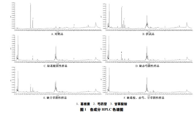 Waters C18 色 譜 柱 ( 4. 6 mm × 250 mm, 5 μm) ; 流動(dòng)相甲醇 ( A) -水 ( 含 0. 2%磷酸) ( B) ,梯度 洗脫 ( 0~ 20 min,15%→35%A; 20 ~ 35 min,35%→4%A;35~ 40 min,4%→65%A; 40~ 55 min,65%A; 55 ~ 70 min, 65%→72%A; 70~ 71 min,72%→80%A; 71~ 80 min,80% A; 80~ 81 min,80%→15%A; 81 ~ 90 min,15%A) ; 檢測 波長 241 nm; 體積流量 1. 0 mL/min; 柱溫 35 ℃ ; 進(jìn)樣量 10 μL。色譜圖見圖 1。精密稱取葛根素、芍藥苷、甘草酸 銨對照品適量,甲醇制成貯備液 ( 三者質(zhì)量濃度分別為 123. 6、241. 6、124. 8 μg /mL) ,分別精密量取 1. 0 mL,置 于 5 mL 量瓶中,甲醇定容至刻度,即得 ( 三者質(zhì)量濃度分 別為 24. 72、48. 32、24. 96 μg /mL) 。驗(yàn) 精密稱取含有量已知的 50 粒膠囊 ( 批號(hào) 161108) 內(nèi)容物 6 份,每份約 0. 2 g,置于具塞錐形瓶 中,加入葛根素 ( 425. 6 μg /mL) 、芍藥苷 ( 952. 8 μg /mL) 、 甘草酸銨 ( 132. 3 μg /mL) 對照品溶液各 1 mL,按 “2. 3” 項(xiàng)下方法平行制備 6 份供試品溶液。