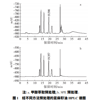 取一苦味亞麻籽油為試驗原料,分別用溶劑萃 取法和固相萃取法進行前處理,通過 HPLC 測定 CLE 含量。所有前處理方法測得的 HPLC 譜圖顯示,通過溶劑萃取法和固相萃取法前處理,CLE 均 可以得到良好的分離效果,所測 CLE 在色譜圖中均 于保留時間 19 min 左右出峰,前處理不影響 CLE 的 出峰。但是,就不同前處理方法油樣的各色譜圖的 雜峰而言,與 SPE 硅膠小柱前處理相比,溶劑萃取 前處理后油樣的色譜圖中保留時間在 28 min 以后 有較多雜峰,其中含有較多的甘油三酯,這些雜質的 存在對于保護液相色譜柱、提高柱效是極為不利的。 溶劑萃取預處理亞麻籽油的 HPLC 譜圖之所以有大 量雜峰,是由于油脂在萃取溶劑中存在一定程度的 溶解,尤其是乙醇萃取法樣品,由于其對油脂溶解性 相對更好,雜峰尤為明顯,即使以油脂溶解性較 差的甲醇為例,甲醇萃取法預處理油樣的 HPLC 譜 圖中,所含雜質的峰面積是 CLE 峰面積的 7. 14 倍, 而 SPE 硅膠小柱前處理油樣將甘油三酯及其他雜 質有效去除,其色譜圖所含雜質的峰面積是 CLE 峰 面積的 4. 23 倍( 甲醇萃取預處理和 SPE 預處理亞 麻籽油 HPLC 譜圖見圖 1,其余色譜圖略) 。因此, 為了保護色譜柱、提高柱效、延長柱子使用壽命,固 相萃取法預處理較溶劑萃取更理想。