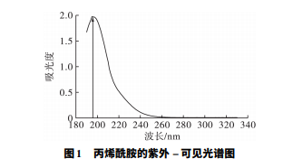 采用雙光束紫外 - 可見分光光度計對 10 μg /mL 的丙烯酰胺標準溶液進行全波長掃描,得到丙烯酰 胺的紫外 - 可見分光光度計全波長掃描圖如圖 1 所示。