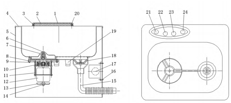 總成,18. 普通水槽,19. 排水閥,20. 超聲波發(fā)生器固定螺釘,21. 溢流管,22. 溢流管固定螺釘,23. 程序控制板固定螺釘,24. 電源按鍵,25. 波輪