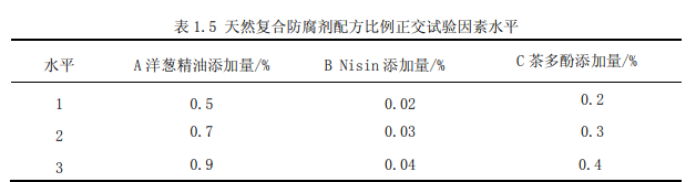 將洋蔥精油以 0.10%、0.30%、0.50%、0.70%、0.90%的比例,乳酸鏈球菌素以 0.01%、 0.02%、0.03%、0.04%、0.05%的比例,茶多酚以 0.05%、0.10 %、0.20%、0.30%、0.40%的 比例分別添加到處理后的低溫雞肉中,進(jìn)行了單因素試驗,其它配方添加質(zhì)量和加工工藝不 變,以低溫雞肉細(xì)菌總數(shù)為評價指標(biāo),篩選出天然復(fù)合防腐劑的最佳添加比例分別為洋蔥精 油 0.70%,Nisin0.03%,茶多酚 0.30%。 通過正交試驗,可知三個因素對樣品細(xì)菌總數(shù)影響的主次順序為:洋蔥精油>茶多酚> 乳酸鏈球菌素;最優(yōu)的因素水平組合為 A?B?C1,即天然復(fù)合防腐劑三種成分比例的最佳組合 為洋蔥精油添加 0.70%、乳酸鏈球菌素添加 0.03%、茶多酚添加 0.20%。低溫雞肉樣品細(xì)菌 總數(shù)在經(jīng)過最優(yōu)水平組合比例處理后為 85 cfu/g。 試驗證明復(fù)合防腐劑可有效延長低溫肉制品的保藏期,給低溫肉制品的保藏提供了可行 的辦法,為低溫肉制品發(fā)展奠定基礎(chǔ)。