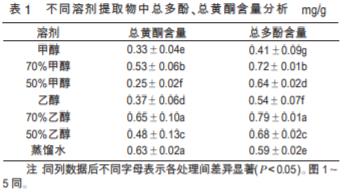 由表 1 可知,不同溶劑提取物中總黃酮和總多 酚的含量存在一定的差異。總黃酮含量在不同溶劑 提取液中約為 0.25~0.65 mg/g,其中,70%乙醇中的 總黃酮含量最高;其次為蒸餾水,但其與 70%乙醇 間差異不顯著(P>0.05);含量最低的為 50%甲醇 提取劑,總黃酮含量為(0.25±0.02)mg/g。玉米須不 同溶劑提取物中總多酚含量為 0.41~0.79 mg/g,其 中,以 70%乙醇為溶劑時提取物中的總多酚含量較 高,而以甲醇為溶劑的提取物中的總多酚含量最 低。綜合分析可知,提取玉米須的總黃酮和總多酚 適于采用 70%的乙醇作為提取溶劑。華艷宏等研 究也發現,藜麥種子中的總黃酮和總多酚利用 70% 的乙醇作為提取溶劑時,提取量較高。