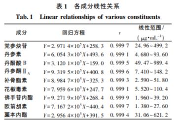 本實驗采用 HPLC 法同時測定了復方黨參片中 黨參炔苷、丹參素、丹酚酸 B、丹參酮ⅡA、補骨 脂素、花椒毒素、佛手苷內酯、歐前胡素、藁本內 酯的含有量,該方法準確度高,重復性好,可用于 該制劑質量標準的提高和完善。