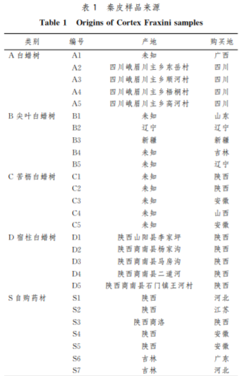 色譜純甲醇(美國J.T.Baker公司)用 于秦皮樣品提取物的制備和分析;色譜純乙酸購于 迪馬科技公司;水為娃哈哈純凈水(中國杭州娃哈哈 集團有限公司)。 對照品 秦 皮 甲 素 (批 號 為 110741-200506)、秦 皮乙 素 (批 號 為 110741-200506)、秦 皮 素 (批 號 為 111731-200501)、莨 菪 亭(批 號 為 110768-200504)、異莨菪亭(批號為111741-200501)、丁香苷(批號為 111574-200603),均由中國食品藥品檢定研究院提 供(中國北京)。對照品秦皮苷(批號為20111214)、 橄欖 苦 苷 (批 號 為 20111214)、毛 柳 苷 (批 號 為 20110921)購 于 鼎 瑞 化 工(上 海)有 限 公 司;對 照 品 6-羥基-7,8-二甲氧 基 香 豆 素、8-羥 基-6,7-二 甲 氧 基 香豆素由中國中醫科學院中醫基礎理論研究所提 供,經 HPLC分析,純度均大于98%。 55批樣品采集于國內各產地,為不同批次樣品 (表1)。樣 品 A1~A5、B1~B5、C1~C5、D1~D5 分別來源于白蠟樹、尖葉白蠟樹、苦櫪白蠟樹和宿柱 白蠟樹;W1~ W3 秦皮混淆品分別來源于毛白蠟 樹、黑蠟子樹和秦嶺白蠟樹。以上樣品均由中國中 醫研究院劉麗梅教授提供。樣品 Sd為秦皮對照藥 材———白蠟樹,購于中國食品藥品 檢 定 研 究 院。市 售樣品S1~S31采購于全國各藥店。