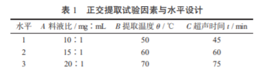 稱取檳榔碎塊 9 份,每份 2.0 g,采用 L(9 34 )正交 試驗表進行試驗設計,結合單因素試驗結果,以甜蜜 素提取率為指標,考查料液比 (A)、提取溫度 (B)、 超聲時間 (C) 3 個因素對甜蜜素提取率的影響。 正交提取試驗因素與水平設計見表 1。